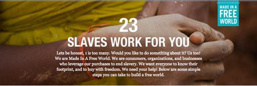 Slavery FootPrint est une campagne initiée par un groupement d’organisations et d’individuels, dans le but d’oeuvrer à éradiquer le travail forcé des produits que nous consommons au quotidien. Bien que proposée en anglais, la navigation sur le site est aisée, et s’articule autour des deux entrées principales.
