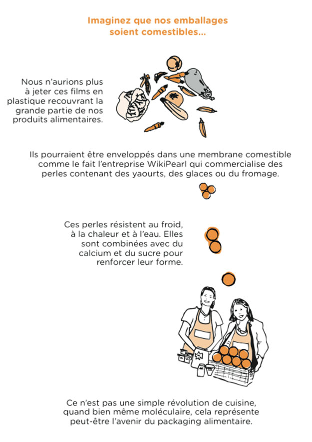 il est clair que la vente de boule de glace comestible en grande surface est risible, puisque cet exemple mémorable était dans un sur-emballage plastique. Par contre j’y vois un exemple d’utilisation (très réduit) : les fastfood et assimilé : le fastfood pourrait se faire livrer dans des récipients « circulaire » style verre transparent une grande quantité de mayonnaise ou glace et les distribuer à leur client directement sur leur plateau sans passer par un emballage plastique. Ceci dit, avant d’en arriver à traquer ces « grammes d’emballage », commençons par les emballages des fastfood qui sont recyclable/compostable (par exemple la boite en carton des burgers) mais qui dans la pratique ne le sont pas (jetés dans les poubelles pour l’incinération)