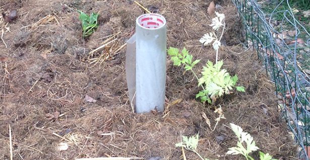 10. Réalisez trois fagots de branchages de 10 à 15 centimètres de diamètre et enfoncez-les dans le sol jusqu’au niveau du carton, arrosez abondamment et le tour est joué ! Ces fagots permettront par la suite de ramener l’eau de vos arrosage directement à la racine des plantes et là où elle sera stockée le plus longtemps.