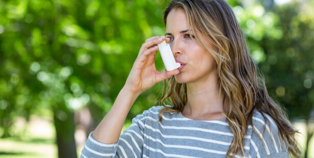 Jeune femme utilisant un inhalateur de Ventoline © wavebreakmedia