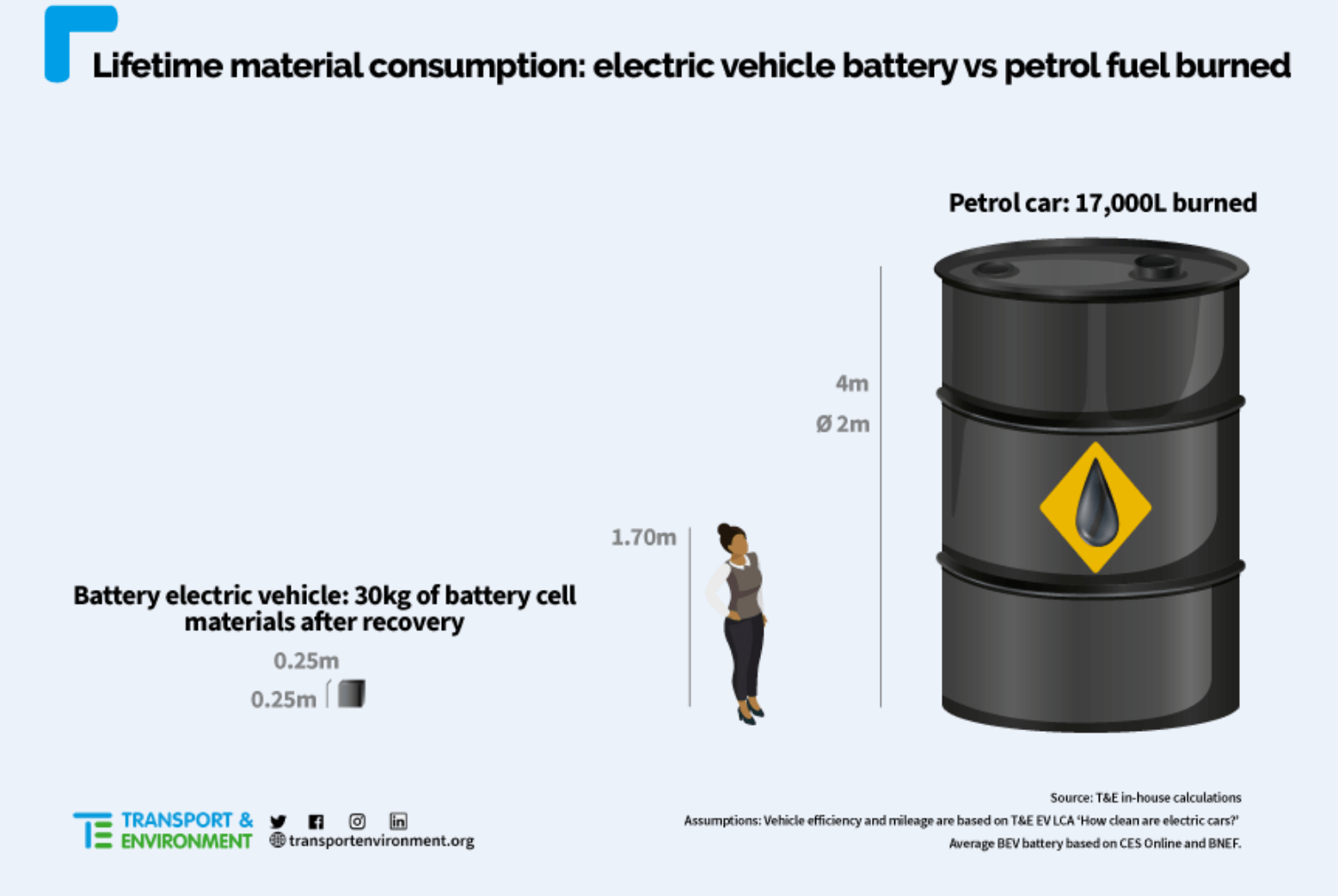 « En matière de matières premières, il n’y a tout simplement pas de comparaison possible, décrypte Lucien Mathieu, analyste transport et e-mobilité chez T&E. Au cours de sa vie, une voiture à combustible fossile moyenne brûle l’équivalent d’une pile de barils de pétrole haute de 25 étages. Si vous prenez en compte le recyclage des matériaux des batteries, seuls environ 30 kg de métaux seraient perdus, soit à peu près la taille d’un ballon de football ».