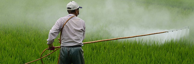 Illustration bannière : exploitant pulvérisant des pesticides dans une rizière près d’Avignon