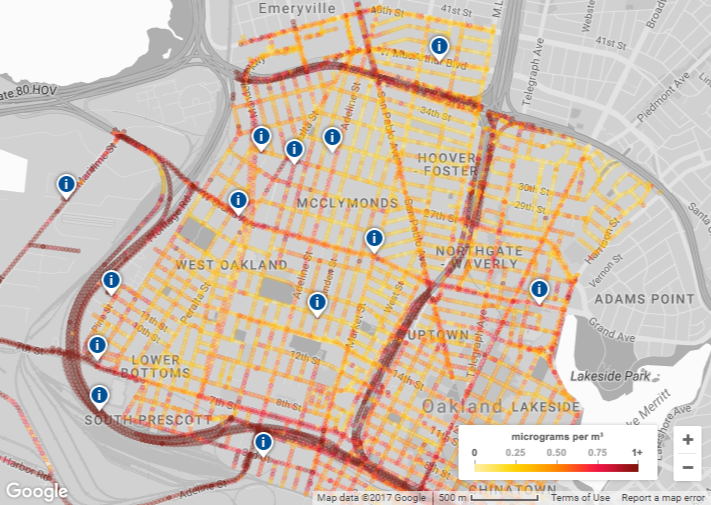 Google Maps a cartographié à Oakland, en Californie le premier plan qui révèle la pollution de l’air, quartier par quartier.