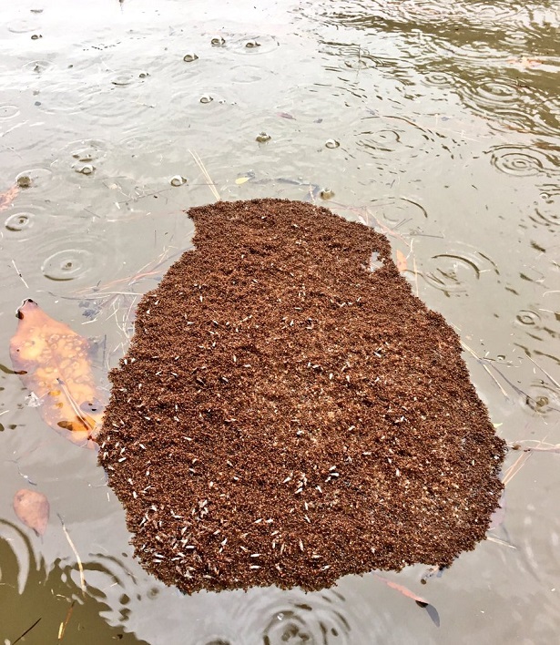 Des colonies de fourmis de feu, vivant habituellement sous terre, ont survécu aux inondations en construisant un radeau vivant, assemblé de tous leurs corps. Elles ont pu ainsi flotter à la dérive dans les eaux troubles des inondations.