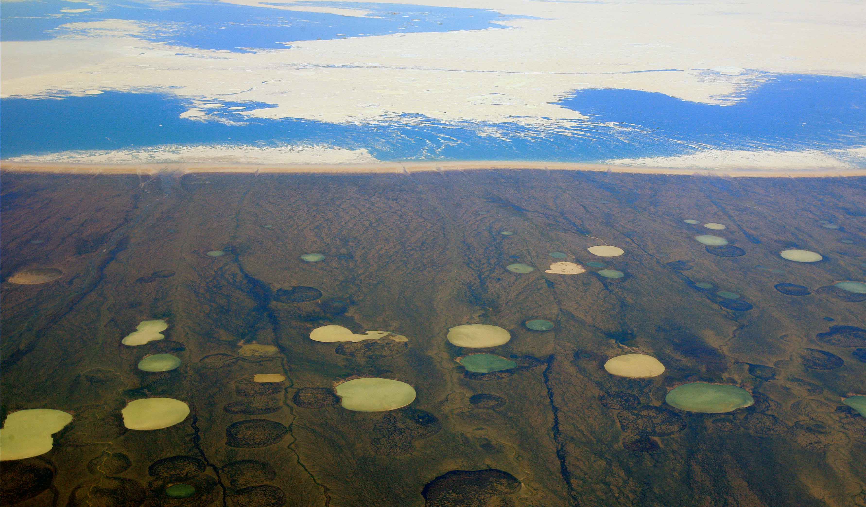 Trous de fonte de permafrost dans le nord du Canada, près du Groenland. Permafrost thaw ponds in Hudson Bay Canada near Greenland » de S.Jurvetson. License sous CC BY 2.0 via Wikimedia Commons