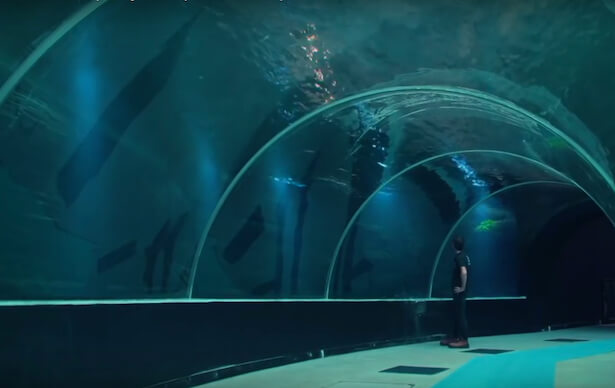 Une imposante baie vitrée de vingt mètres permet de les observer. Un tunnel sous-marin transparent traverse par ailleurs ce nouvel aquarium record qui espère accueillir un million de visiteurs du monde entier. Au total, 60.000 animaux s’offrent à la vue des visiteurs.