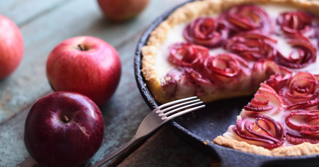 Si vous aimez ces fruits d’automne, vous êtes certainement adepte de la traditionnelle tarte aux pommes. Aujourd’hui, nous vous proposons une recette de tarte aux pommes « revisitée » avec du confit de pétale de rose et des pignons… un doux délice pour les papilles !