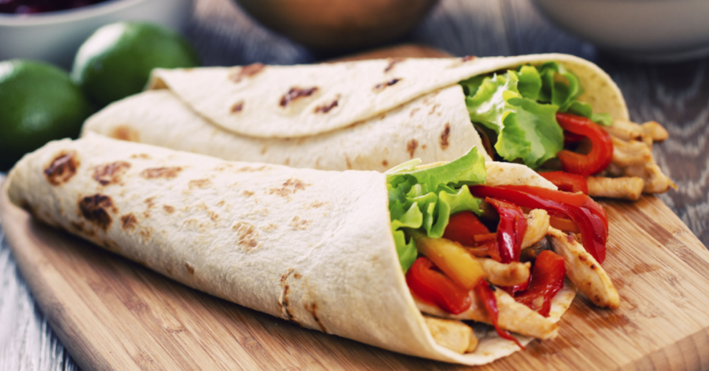 Faites mariner des crevettes dans un mélange huile d’olive, citron et chili. Pendant ce temps, faites revenir des poivrons et des oignons dans une poêle. Ajoutez les crevettes. Garnissez les fajitas de ce mélange en ajoutant des crudités.