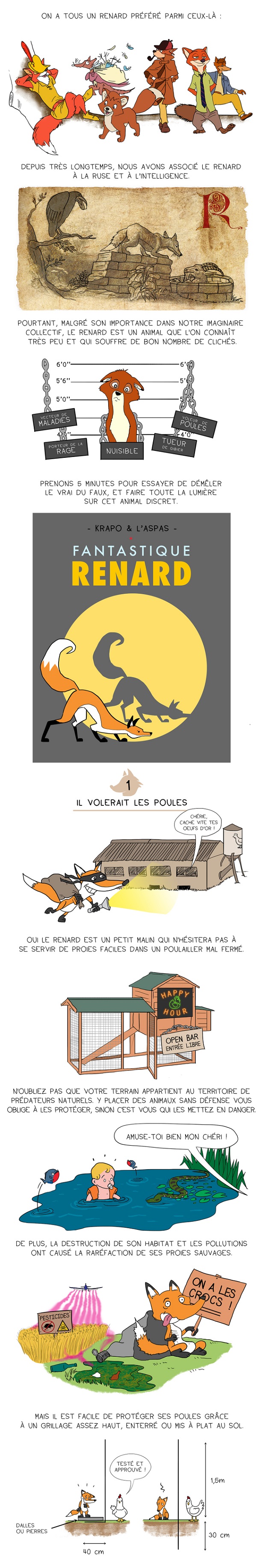 Le renard a souvent mauvaise réputation. Rusé voire sournois, voleur de poules, vecteur de maladies… il est parfois utilisé pour faire peur aux enfants. Pourtant, il est tout à fait inoffensif et il est même très utile dans la chaîne alimentaire. Le dessinateur de BD Krapo le réhabilite en quelques bulles. Une BD bien faite, rigolote, facile à lire qui met en vedette le renard !