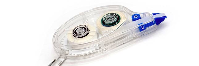 Si vous ne désirez pas attendre que le fluide sèche pour réécrire par dessus, ou pour les gauchers qui en ont marre d’avoir la main peinte en blanc, vous pouvez choisir un ruban correcteur. Les rubans correcteurs ne semblent pas la solution la plus écologique si jamais l’on doit corriger ses fautes : en plastique, avec de nombreux petits éléments à l’intérieur, l’objet n’est pas recyclable.