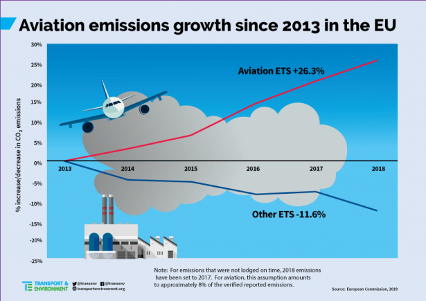 Évolution des émissions depuis 2013 dans l’Union Européenne. La courbe en rouge représente les quotas d’émissions du secteur aérien en Europe. Celle en bleu indique l’évolution des autres secteurs © Transport and Environment