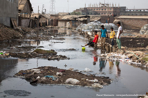 Ici, la plupart des tanneries utilisent des méthodes de traitement obsolètes et déversent chaque jour 22.000 litres cubes de déchets toxiques dans le principal fleuve de Dhaka. Les habitants font face à des taux élevés de maladies cutanées et respiratoires, ainsi que des brûlures à l’acide, des éruptions cutanées, vertiges et nausées.