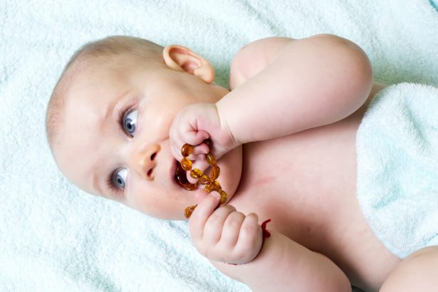 Faut-il ou non opter pour un collier d’ambre lorsque son bébé fait ses dents ? L’ambre est un minéral issu de la fossilisation de résine de pins. Généralement de couleur orangée, l’ambre aurait pour effet au contact de la peau et de la chaleur d’apaiser bébé et de calmer les douleurs provoquées par les poussées dentaires.