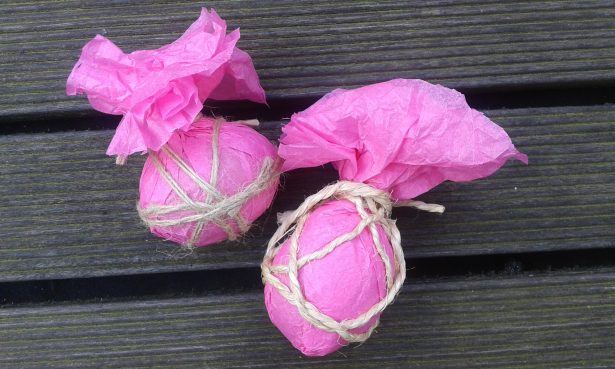 Dispersez vos oeufs ainsi emballés sur la table, placez-les dans un nid conçu à cet effet ou accrochez-les aux branches dans le jardin.