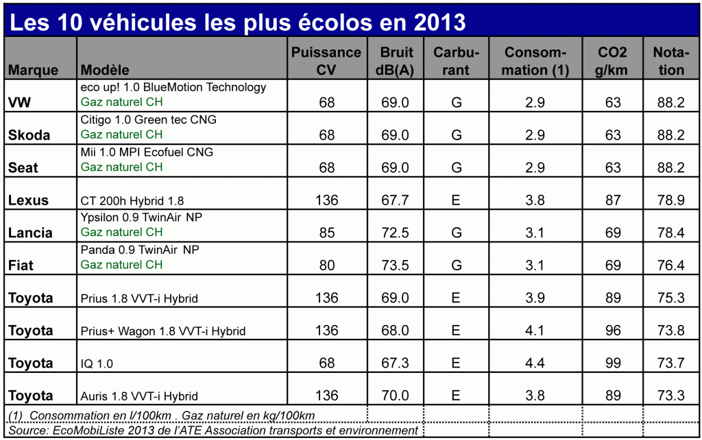 A ses côtés et parmi les dix meilleures se classent quand même trois voitures hybrides. Une seule voiture à essence arrive à se faire une place dans le top 10 : la Toyota IQ. Aucune voiture diesel ne se place dans ce palmarès, malgré leur faible émission de CO2. Malgré les filtres à particules, efficaces pour les particules fines, les diesels émettent plus d’oxydes d’azote, nocifs pour la santé. (Peut-on et doit-on interdire le diesel ?)