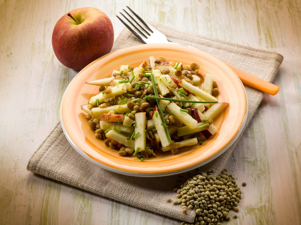 - Mélangez les lentilles, la pomme coupée et les noix.