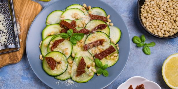 Carpaccio de courgettes, basilic, tomates séchées et parmesan