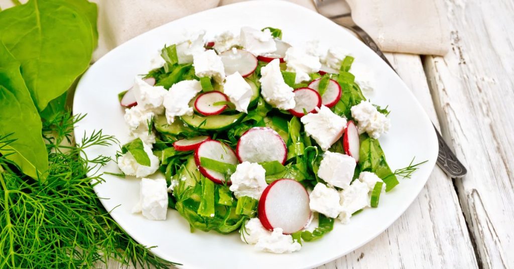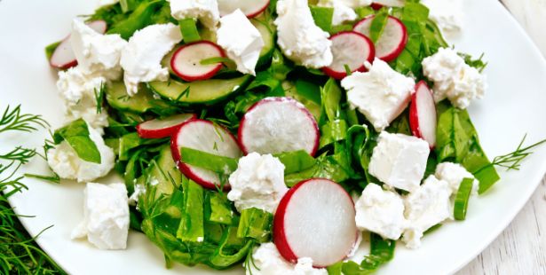 2. Dans un saladier, mélangez le vinaigre, l’huile, le sel et le poivre. Ajouter les tranches de concombre et les radis. Ajoutez également la feta émiettée.