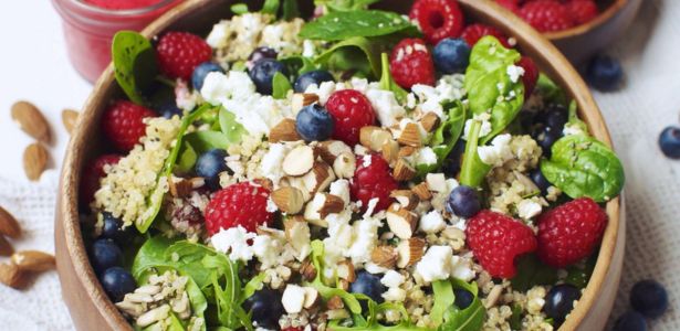 - Dans un grand saladier, mélangez les épinards, le quinoa et les baies.