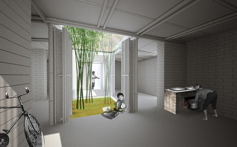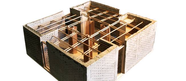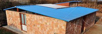 Ces blocs de base sont réalisés avec des murs en briques creuses en terre, renforcés par des barres d’acier. La structure de la maison est couverte par un plafond en bambou et un toit ondulé. Les poutres en bois des caissons résistent à un séisme de magnitude 8.