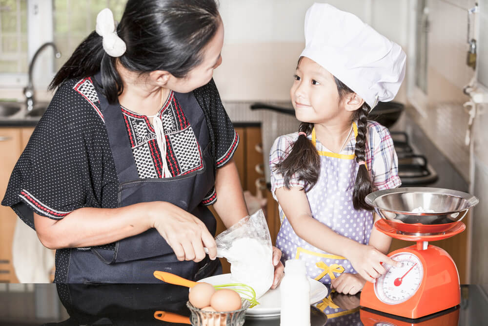 C’est prouvé, faire la cuisine avec les enfants comporte de nombreux avantages : cela leur permet de leur inculquer facilement l’équilibre alimentaire et les bases de la gastronomie. De plus, on peut aussi en profiter pour réviser les mathématiques ou la lecture : combien de centilitres dans 1/2 l de lait ?