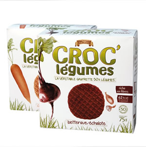 Après les cacahuètes, chips et autres biscuits apéritifs gras ultra-salés, place aux Croc’légumes, des gaufrettes riches en fibres, peu caloriques et contenant au moins 50 % de légumes.
