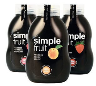 Présentées en flacon souple noir de 320 g pour une praticité d’utilisation, les confitures Simple fruit sont constituées de 80 % de fruits (fraises, abricots, ou framboises).