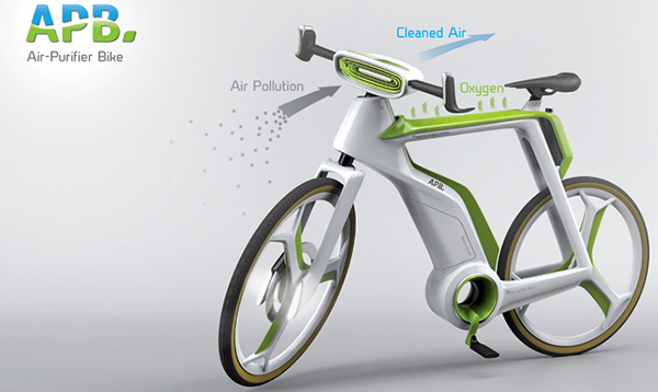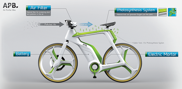 Imaginez que les véhicules autour de vous reproduisent la photosynthèse tels des arbres au lieu de dégager de la pollution. C’est l’idée de départ de APB, pour Air-Purifier Bike (vélo dépolluant de l’air).