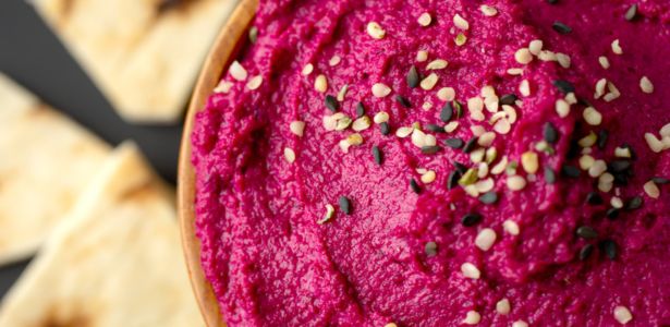 Pour le houmous, mixez une betterave cuite, une boîte de pois chiches, une gousse d’ail, le jus d’un citron, deux cuillères à soupe de tahini (pâte de sésame), et de l’huile d’olive jusqu’à obtenir une consistance crémeuse. Servez avec des crackers de seigle, des bâtonnets de légumes ou des tranches de pain grillé.