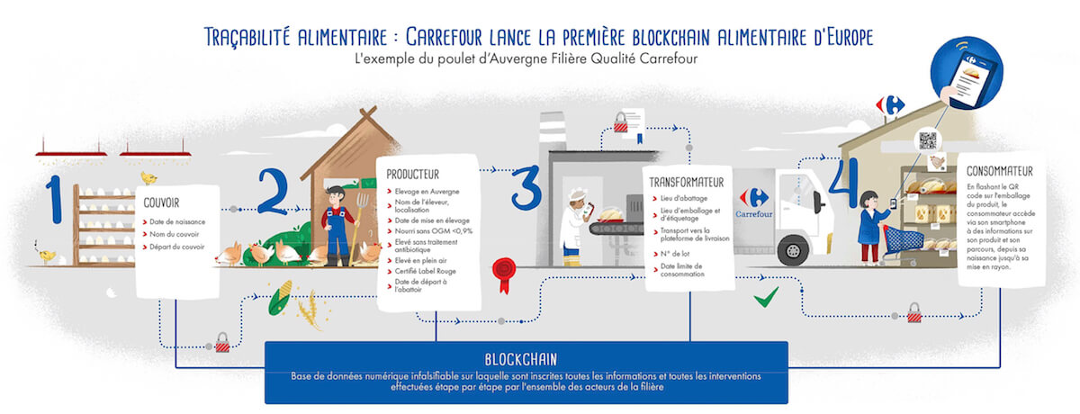 Via la blockchain Carrefour, tous les acteurs de la chaîne d’approvisionnement pourront fournir des informations de traçabilité qui les concernent et en obtenir d’autres pour chaque lot, qu’il s’agisse des producteurs, des transformateurs ou des distributeurs.