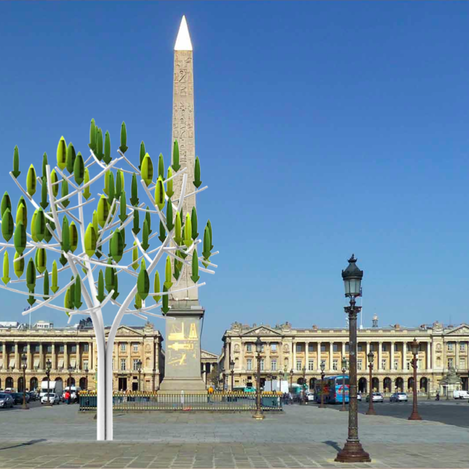 Du 12 mars au 12 mai 2015, ‘Arbre à Vent® sera installé à Paris PLACE DE LA CONCORDE.NewWind installera pour la première fois un démonstrateur de l’Arbre à Vent au coeur d’une ville. Cette expérience pédagogique originale est aussi une sensibilisation du public à la production d’énergie renouvelable en ville. La place de la Concorde est le site retenu car c’est là que fut installé le premier éclairage électrique de la ville, en 1844, pour éclairer l’obélisque de Louxor (lampes à arc). L’Arbre à Vent fera revivre aux parisiens une démonstration électrique innovante, 171 ans après ! A la veille de la COP 21, cet événement sera un temps fort pour l’attractivité de Paris, ville innovante et durable.