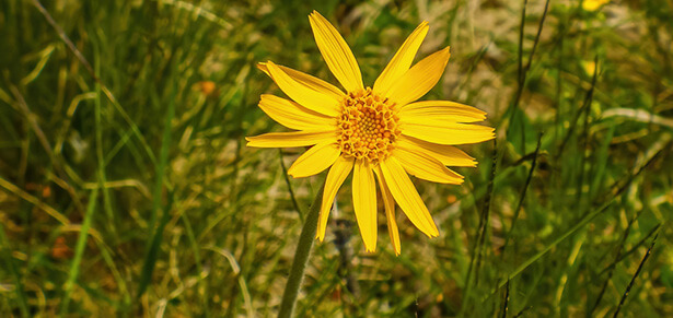 Arnica montana est, comme son nom l’indique, une plante de la famille des astéracées poussant en altitude. Facilement repérable par le randonneur amateur, elle se caractérise par une fleur unique d’un orange soutenu aux pétales souvent en bataille qui lui donnent un air un peu négligé, au bout d’une haute tige portant des feuilles pointues et légèrement velues. Ne vous fiez pourtant pas à son aspect peu soigné : l’arnica a plus d’un tour dans son pistil.