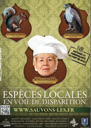 Contre cette situation, les artisans et commerçants du Pont du Gard ont souhaité agir et lancent la campagne « Espèces locales en voie de disparition ; sauvons-les !« .