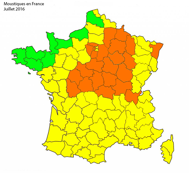 Les moustiques ont été signalés dans une large partie du territoire, à l’exception de la Bretagne, de la Normandie et du Pas-de-Calais. Sur le centre de la France, englobant également l’Île-de-France et la Champagne-Ardennes, les habitants doivent faire face à une prolifération inhabituelle de moustiques, sans doute parce que ces régions ont été particulièrement arrosées au cours des derniers mois, favorisant la création de foyers d’infestation pour plus tard.