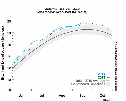 Le 12 septembre 2014, la taille de la banquise avait ainsi atteint le double du continent Antarctique, l’équivalent de trois fois la superficie de l’Australie. Soit 19.619.000 kilomètres carrés couverts de glace, le plus haut niveau jamais relevé.