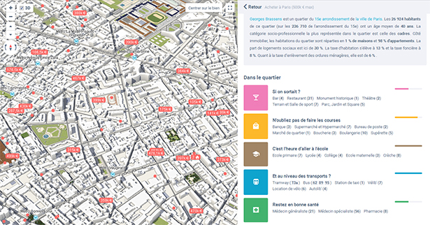 Une carte 3D permet ensuite de visualiser en temps réel, les biens disponibles dans la zone géographique souhaitée. Enfin, en cliquant sur l’un des biens, on accède à sa fiche, qui répertorie les points d’intérêt dans le quartier, tels que transports, écoles, commerces et autres services à proximité. Par exemple, la présence d’une ligne de tramway, d’une station de location de vélo ou d’un marché de quartier.