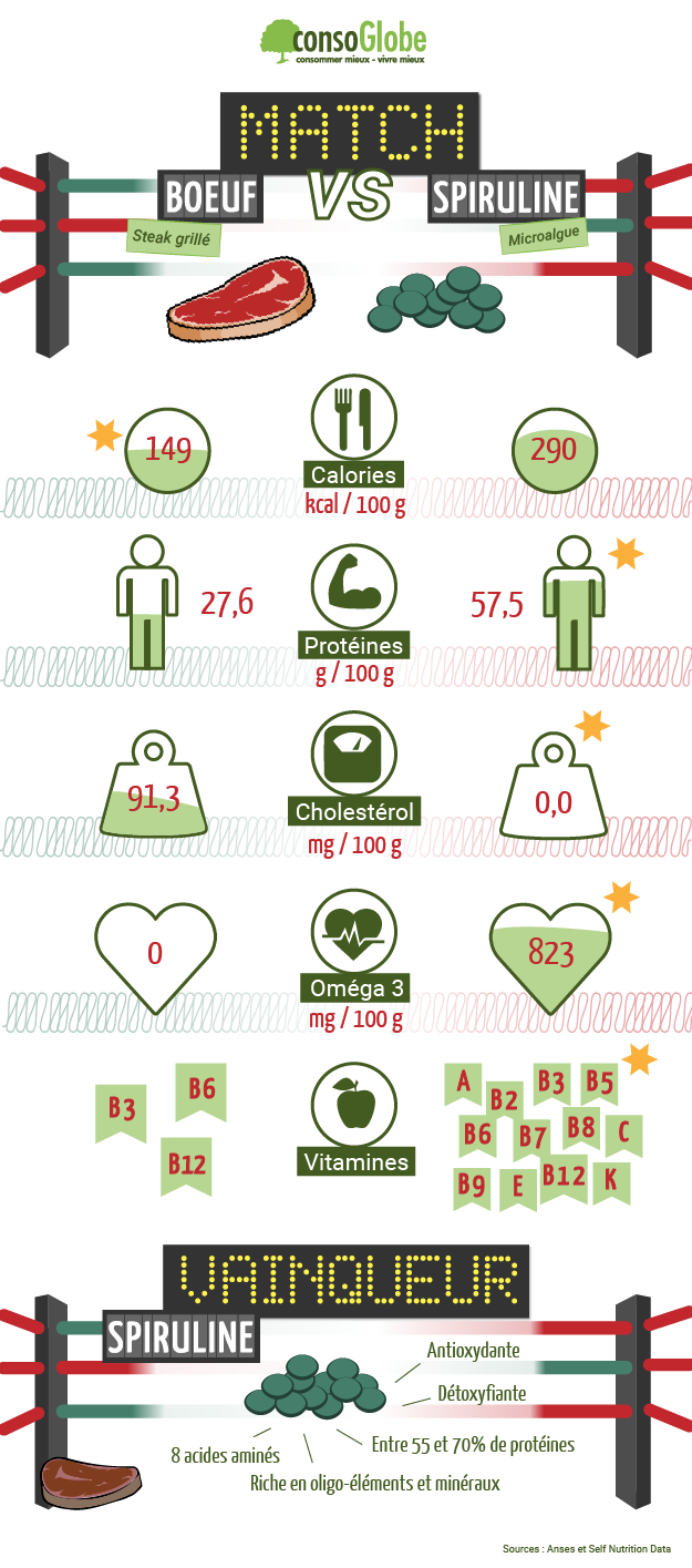 D’un côté du ring, l’une des viandes les moins grasses et des plus recommandées dans les régimes : le boeuf ; de l’autre, une microalgue qui a le vent en poupe : la spiruline. D’après vous, qui est le gagnant santé ?