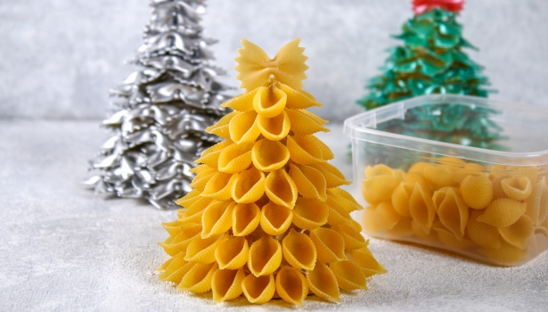 Découpez une plaque de carton en forme de cône et fixez-la avec du ruban adhésif ou de la colle pour former la structure de votre sapin. Utilisez des pâtes en forme (comme des farfalles ou des penne) et fixez-les sur le cône avec de la colle chaude, en partant de la base et en montant progressivement