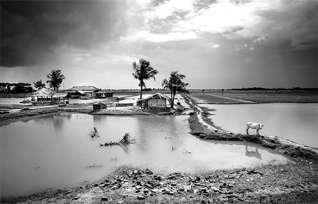 Les experts du Groupe d’experts intergouvernemental sur l’évolution du climat (GIEC) ont rendu début fin 2013 leur 5ème rapport sur le changement climatique. Le lien entre l’activité humaine et l’augmentation des températures moyennes sur le globe est à présent indiscutable. Au Bangladesh, les plaines et les rizières sont en proie à de violentes averses que le sol ne parvient plus à absorber. Situées à l’opposé de la rivière, protégées par la digue, ces immenses étendues permettent de nourrir la région, de produire du riz destiné à l’exportation.