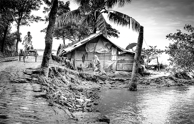 La digue qui mène à Chalna est largement affaiblie par les crues du fleuve Pasur. L’édifice en argile et pavé de briques fut reconstruit après le passage du cyclone Aila en mai 2009. L’absence d’ingénieurs, de moyens techniques performants et de vision à long terme handicapent la région pour lutter efficacement contre la montée des eaux.
