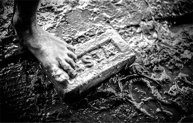 Dans cette région, la terre est à ce point imprégnée d’eau qu’il est préférable de marcher pied nus. Le sol argileux, forme une masse lourde et épaisse sous les sandales. Un homme réfugié sous un abri de tôles lors d’une averse importante prend appui sur une brique pour éviter de glisser.