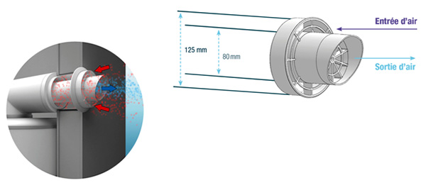 Pour l’entrée et la sortie d’air, l’appareil n’a besoin que d’un seul trou dans le mur pour insérer cette ventouse de faible diamètre (125mm). Il est donc facilement raccordé et on peut aller jusqu’à 5 m de conduit d’air en ventouse et jusqu’à 10m en cheminée.