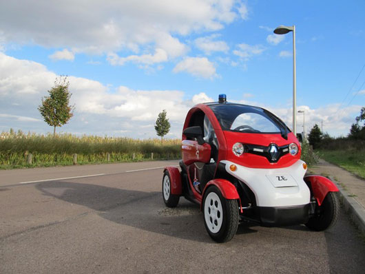 Il est vrai que les pompiers, on a plutôt l’habitude de les voir dans leurs gros camions rouges et leurs sirènes tonitruantes ! Peut-être verrons-nous un jour les pompiers au volant de rutilants Twizy rouges équipés d’un gyrophare dans les rues de Paris. Pour le moment, Renault et les pompiers n’en sont qu’à la phase d’essai, afin de déterminer si le petit véhicule électrique est pertinent ou non dans des situations particulières de secours. Le Twizy a plus d’un tour sous le capot : sa petite taille pour filer dans les rues parfois étroites de la capitale et pour slalomer dans les embouteillages, un coffre assez grand pour embarquer 2 extincteurs, 2 bouteilles d’oxygène, un équipement complet anti-incendie, un casque et une trousse de premiers secours. Le véhicule devrait permettre au pompier d’effectuer les tout premiers soins avant l’arrivée des renforts.