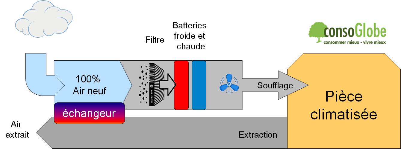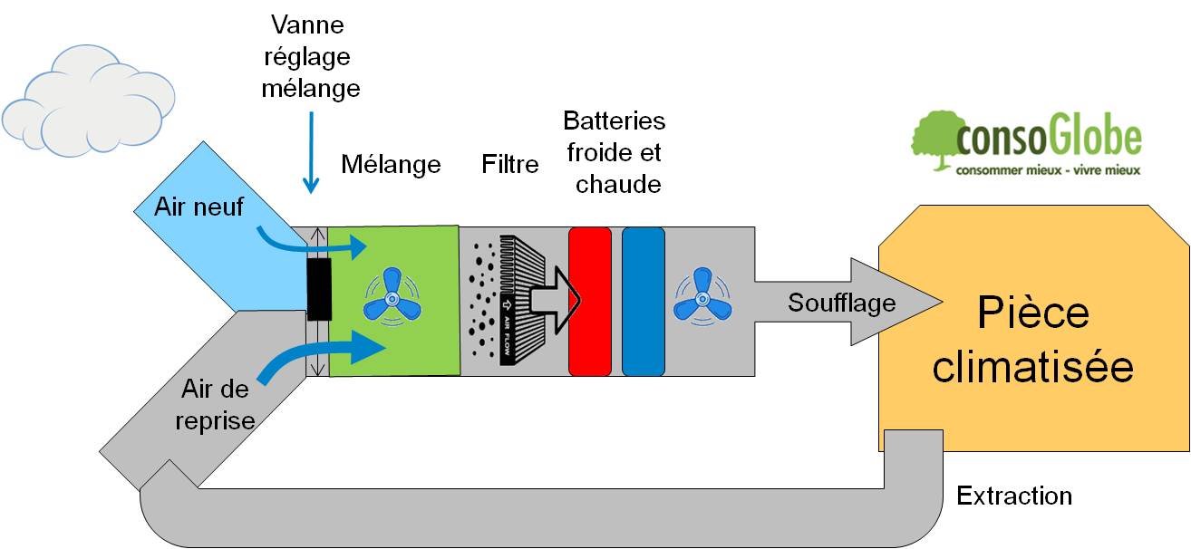 Dans des systèmes collectifs classiques, la régulation de température est réalisée en mélangeant une partie d’air neuf entrant avec une partie d’air « de reprise ». Le mélange traverse ensuite des filtres, puis des échangeurs (batteries froide et chaude) permettant de réguler la température.