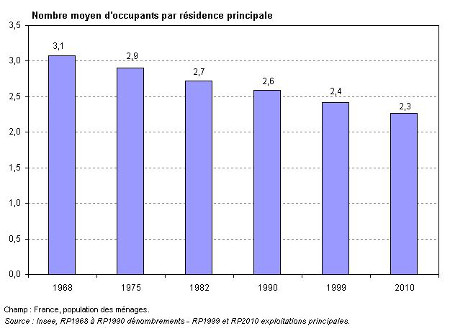 Selon l’Insee, le nombre moyen de personnes par ménage diminue d’année en année, comme le montre ce graphique.