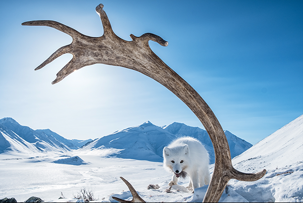 Un renard polaire se nourrissant et pris sur le fait par Peter Mather, photo-journaliste canadien et spécialisé dans les photographies de conservation dans le grand Nord.