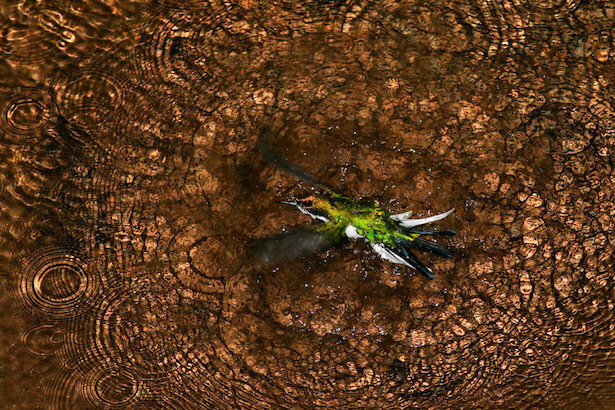 « Les petites piscines naturelles situées au coeur de la forêt tropicale constituent un endroit idéal pour se baigner rapidement. J’ai eu la chance d’être témoin de ce comportement au Costa Rica tôt un matin. Les oiseaux planent au-dessus de l’eau pendant un petit moment, puis subissent de petits creux sous la surface. J’ai été capable de saisir ce moment lorsqu’un colibris féerique (Heliothryx barroti) a quitté l’eau. L’idée d’utiliser le flash pour mettre en évidence les rochers au fond de l’eau a rendu l’eau dorée ».