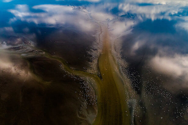« La marée basse révèle la beauté de l’environnement côtier. La zone intertidale est également une bonne aire d’alimentation pour les oiseaux de mer. C’est pourquoi beaucoup de goélands et de hérons se rassemblent en raison de l’abondance de la vie. J’ai attendu plusieurs jours avant d’obtenir la combinaison parfaite d’éléments pour la photo que j’avais en tête : de l’eau calme à marée basse, de beaux nuages et bien sûr des oiseaux. J’ai pris cette photo en utilisant un drone et la magie a duré peu de temps avant que la marée montante ne modifie la scène ».