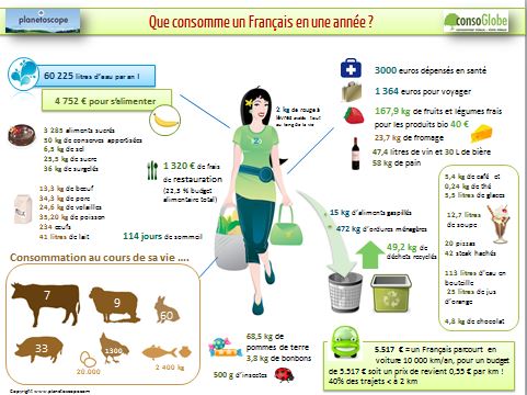 Voici un visuel que consoGlobe a réalisé à partir des données de consommation du Planetoscope : ces quelques données, correspondant à une seule personne « moyenne », laissent imaginer les quantités en jeu à l’échelle de tout un pays… énorme !