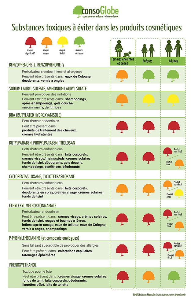Beauté Cosmétiques : 185 produits jugés toxiques selon l’UFC-Que Choisir Dans un communiqué publié le lundi 22 février sur le site de l’association UFC-Que Choisir, 185 produits cosmétiques seraient jugés nocifs pour la santé. L’association a même publié une liste sur la composition de ces 185 produits incriminés. Hugo Quinton 7 mars 2016 Fiche pratique des substances toxiques à éviter Pour ne plus acheter les produits avec des substances jugées nocives pour la santé, c’est clair qu’on ne peut pas apprendre par coeur la liste des 185 produits. C’est pourquoi consoGlobe.com vous propose cette fiche pratique des substances toxiques selon l’UFC-Que Choisir, qui résume les composants à éviter, où on peut les retrouver, et les conséquences qu’ils peuvent avoir pour les femmes enceintes et les bébés, les enfants et les adultes en général. Vous pouvez télécharger la fiche pratique ici. A lire aussi : Cosmétiques bio et naturels : ils embellissent aussi la planèteCosmétiques : méfiez-vous des ingrédients de remplissage !Reportage : les cosmétiques faits maison Références :http://test-comparatif.quechoisir.org/ingredients-indesirables-167993/ (Cliquez sur cette source pour remonter)Plus ici : http://test-comparatif.quechoisir.org/ingredients-indesirables-167993/ (Cliquez sur cette source pour remonter)Plus ici : http://test-comparatif.quechoisir.org/ingredients-indesirables-167993/ (Cliquez sur cette source pour remonter) Pages : 1 2 Plus dans Beauté Comment fabriquer son savon solide naturel soi-même ? Utiliser du savon solide, c'est bien. Le faire soi-même, c'est mieux et plus écologique.... Le macérât de carotte, l’huile bonne mine et teint halé au naturel Manger des carottes est bon pour la forme et pour le teint. C'est bien... Trucs et astuces : avoir de beaux cheveux au naturel Les cheveux sont pour beaucoup de femmes un symbole fort de la féminité. Les... Acné du dos : changer les habitudes sous la douche Les problèmes d'acné ne se limitent pas au visage. Fréquent chez les adolescents et... Découvrez le Piñatex, un cuir à base de fibre d’ananas Des sacs pour les réfugiés faits à partir de leurs bateaux gonflables : soutenez